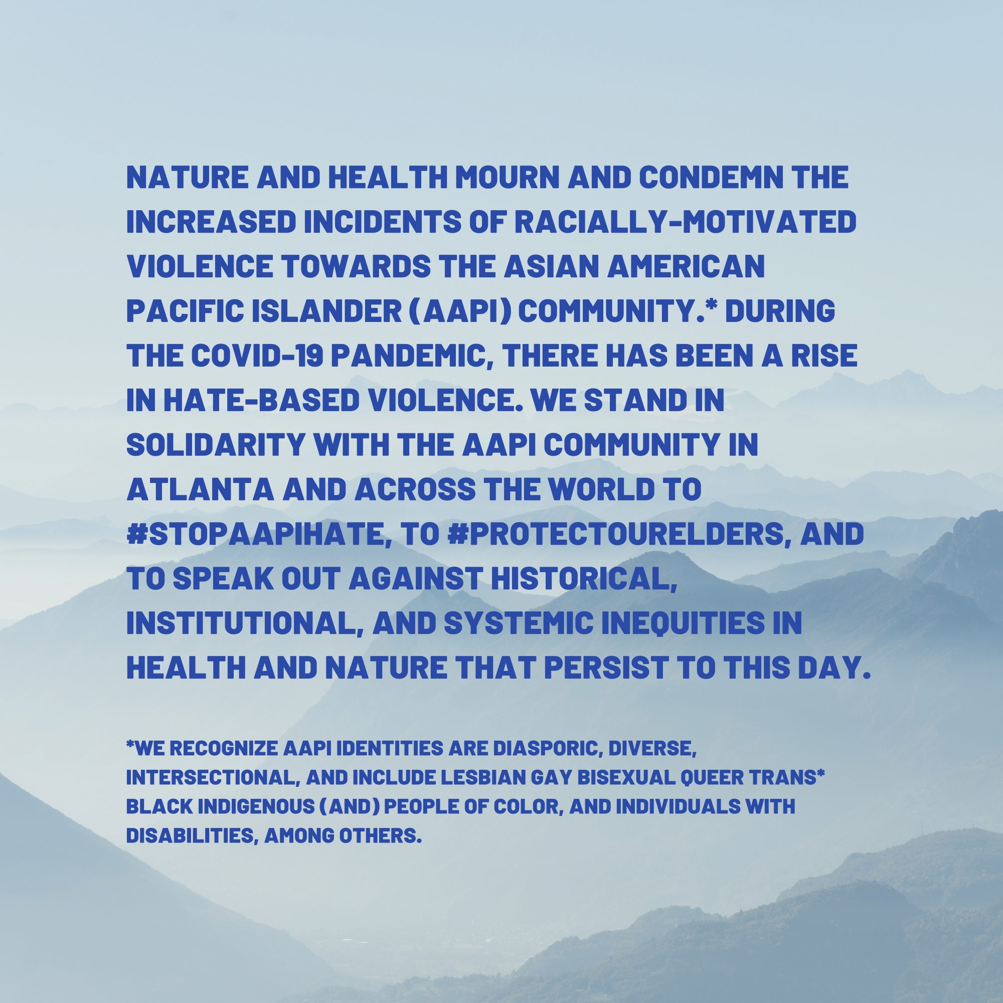 Nature and Health mourns and condemns the increased incidents of racially-motivated violence towards the Asian American Pacific Islander (AAPI) community.* During the COVID-19 pandemic, there has been a rise in hate-based violence. We stand in solidarity with the AAPI community in Atlanta and across the world to #StopAAPIHate, to #ProtectOurElders, and to speak out against historical, institutional, and systemic inequities in health and nature that persist to this day.