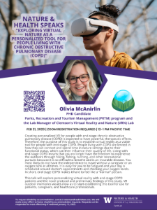 Olivia’s latest research centered on creating personalized nature-based VR for people with end-stage chronic obstructive pulmonary disease (COPD). People living with COPD are limited in how they can connect and spend time in nature settings due to their functional status, which can then influence their quality of life. Living with end-stage COPD means that you no longer have the freedom to experience the outdoors through hiking, fishing, running, and other recreational nature pursuits because it is so difficult to breathe. Personalized, co-created virtual reality experience allows COPD patients to re-experience outdoor memories and a place they love but are no longer able to visit.