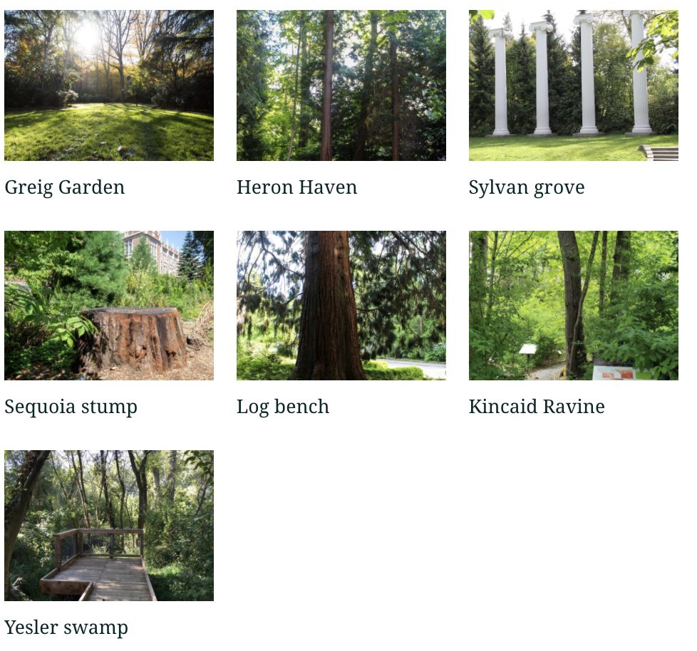 The tri-campus Forest Bathing map represents the collective action of the UW Sustainability Action Plan Engagement Committee (Lauren Updyke, Lauren Brohawn, Toren Elste, Ellen Moore, Cheryl Wheeler, and Daimon Eklund). Daimon created the forest bathing map using Arc GIS StoryMap with site recommendations and photos provided by Alexa (UW Bothell), Cheryl (UW Seattle), and Ellen Moore (UW Tacoma).