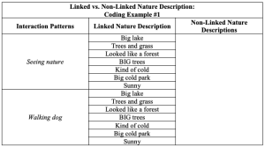 This technical report provides our coding manual – our systematic method to code the qualitative narrative data – from a study of Girl Scouts’ meaningful nature experiences. Other authors on this study (but not on this coding manual) include Joshua J. Lawler, Pooja S. Tandon, Gregory N. Bratman, Sara P. Perrins, and Frances Boyens. Our research question was whether children’s nature interactions that are embodied (vs. only visual) would be associated with eudemonic wellbeing. Using the interaction pattern approach detailed in this coding manual, we coded written narratives from 127 Girl Scouts (8-11 years old) about a recent meaningful nature experience, and, through a novel questionnaire, assessed Presence, a eudemonic state of wellbeing. A total of 372 interactions patterns were coded from the Girl Scouts’ written narratives. Participants who enacted embodied interactions with nature (e.g., “making snowman,” “wrapping arms around tree,” “talking to chickens”) experienced a greater sense of Presence than participants whose interactions relied solely on vision (e.g., “seeing snow,” “seeing moss,” “watching pileated woodpecker”). This technical report provides open access to our core intellectual qualitative work on this project, and can be used by others seeking to employ an interaction pattern approach, or more generally seeking to characterize people’s interactions with nature.