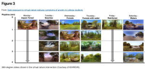 Browning, M. H., Shin, S., Drong, G., McAnirlin, O., Gagnon, R. J., Ranganathan, S., Sindelar, K., Hoptman, D., Bratman, G. N., Yuan, S., Prabhu, V. G. (2023). Daily exposure to virtual nature reduces symptoms of anxiety in college students. Scientific Reports, 13(1), p.1239. https://doi.org/10.1038/s41598-023-28070-9