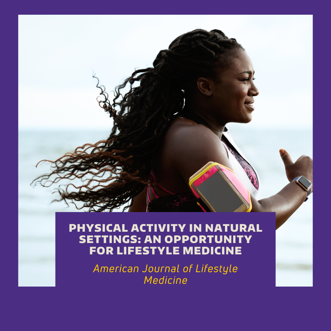 Maddock, J. E., & Frumkin, H. (2024). Physical Activity in Natural Settings: An Opportunity for Lifestyle Medicine. American Journal of Lifestyle Medicine. doi.org/10.1177/15598276241253211