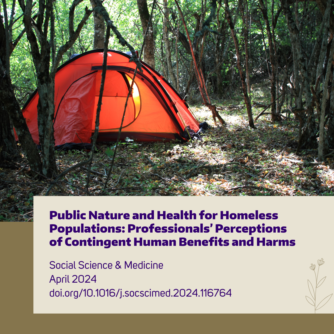 Derrien, M. M., Bratman, G. N., Cerveny, L. K., Levy, C., Blahna, D. J., Frank, P., & Serio, N. (2024). Public nature and health for homeless populations: Professionals’ perceptions of contingent human benefits and harms. Social Science & Medicine, 347(14), 116764. https://doi.org/10.1016/j.socscimed.2024.116764