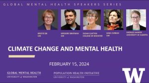 This February session features a panel discussion on the relationship of global mental health and climate change with speakers, Drs. Kristie Ebi, Gregory Bratman (co-director of UW Nature and Health), Sara Curran, and Sherilee Harper.